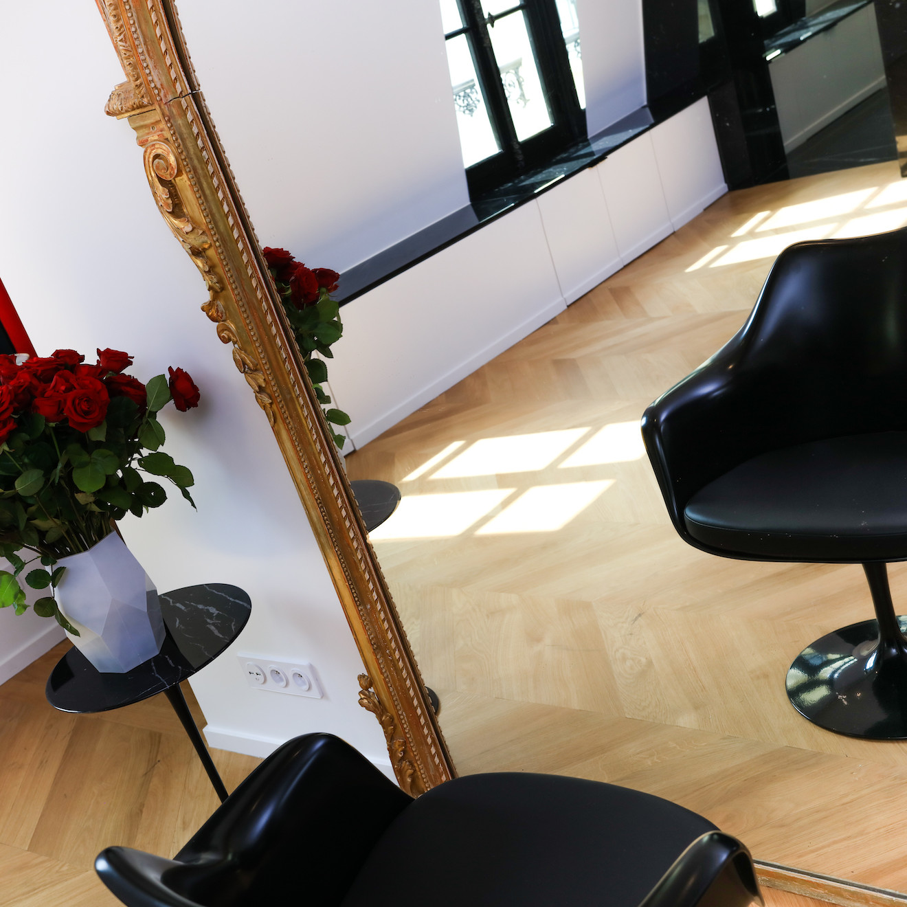 C’est dans une pièce volontairement sombre, pour encore plus de quiétude, que seront prodigués les soins des cheveux et du cuir chevelu. Ici le confort fait entièrement partie de la philosophie du soin, aussi bien pour le coiffeur que pour celle ou celui qui recevra le soin. Au plafond, la spectaculaire création « fishes » de Gournay sur papier de soie et feuille d’or, invite au rêve et à l’apaisement pour une efficacité décuplée.